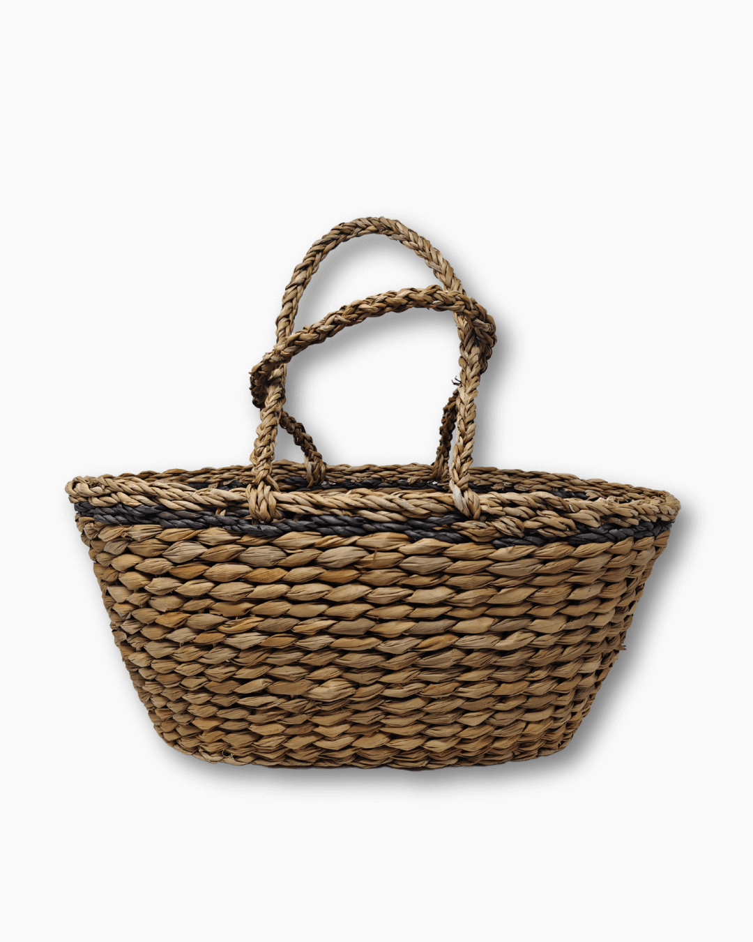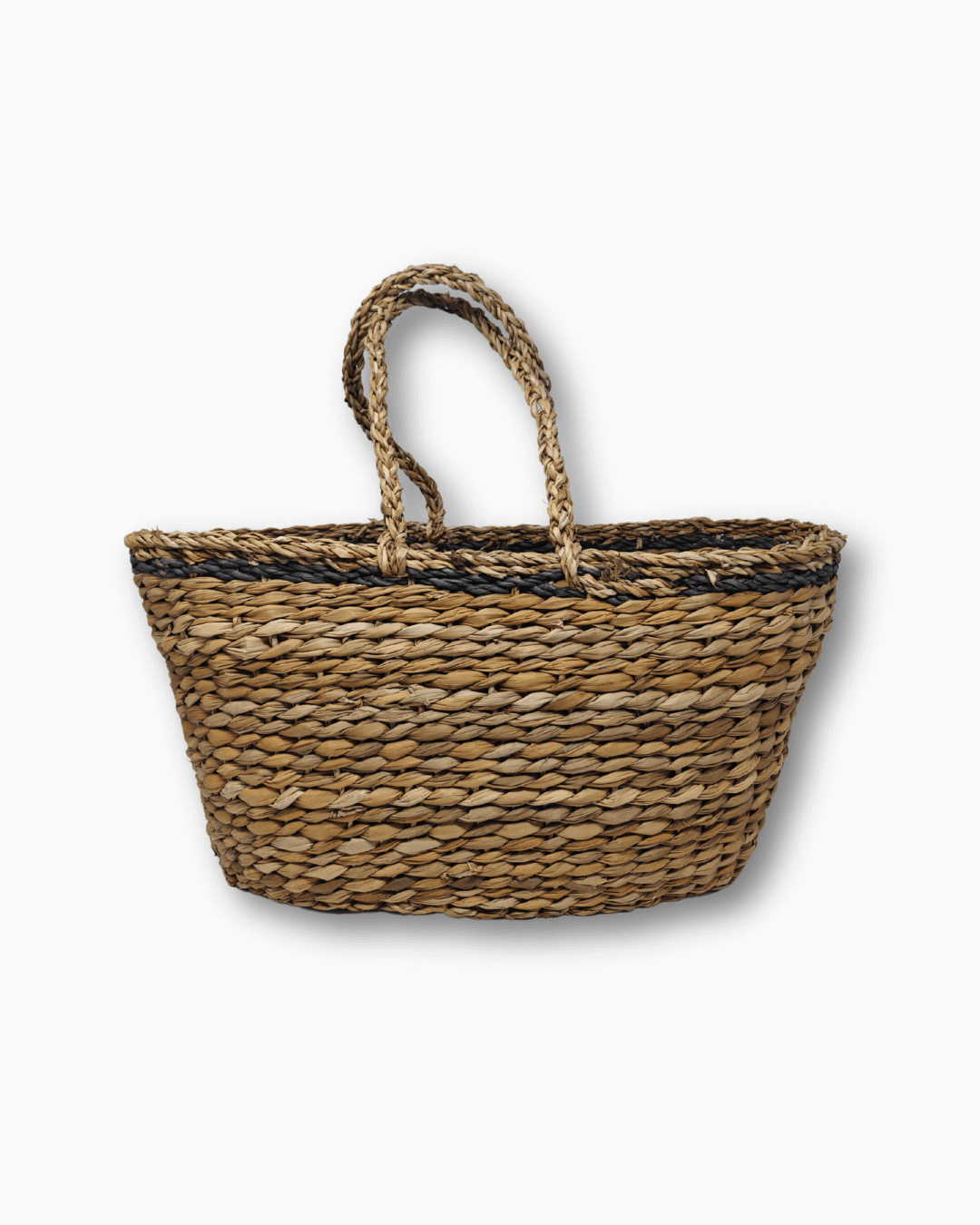 Set of 2 Round Hogla Grass Bowl Baskets with Handles, Handwoven from natural hogla grass, grown in mangrove waters and dried in the sun before being woven into beautiful and functional items. Each basket has a handle and can serve multiple purposes. This set includes two nesting baskets, with the largest being the perfect size for various uses.