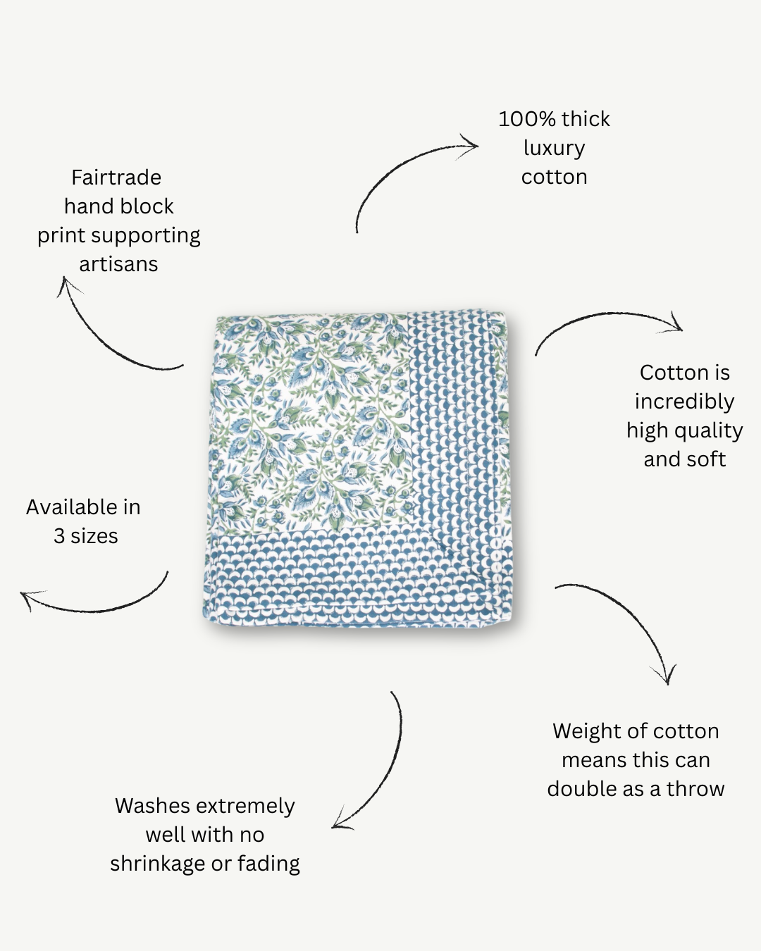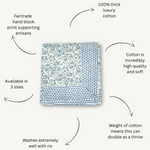 All our Rozablue tablecloths are hand printed in India on 100% fair trade cotton and treated to prevent colour loss.