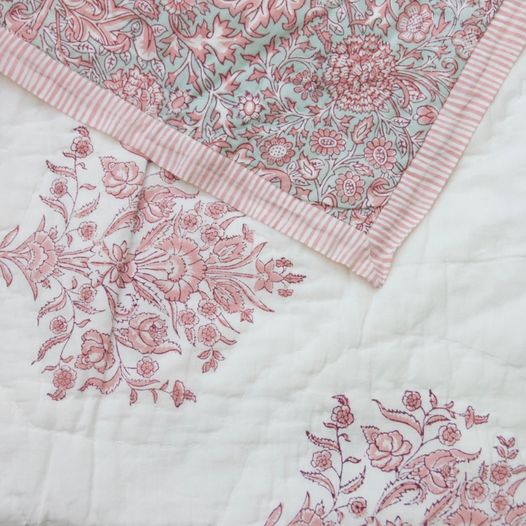 Wrap yourself in the beauty of handcrafted luxury with our hand-block printed bedspreads made from organic, fair-trade cotton. Each quilt is meticulously printed by skilled artisans using traditional techniques, creating delicate, time-honored patterns that bring warmth and elegance to your bedroom.