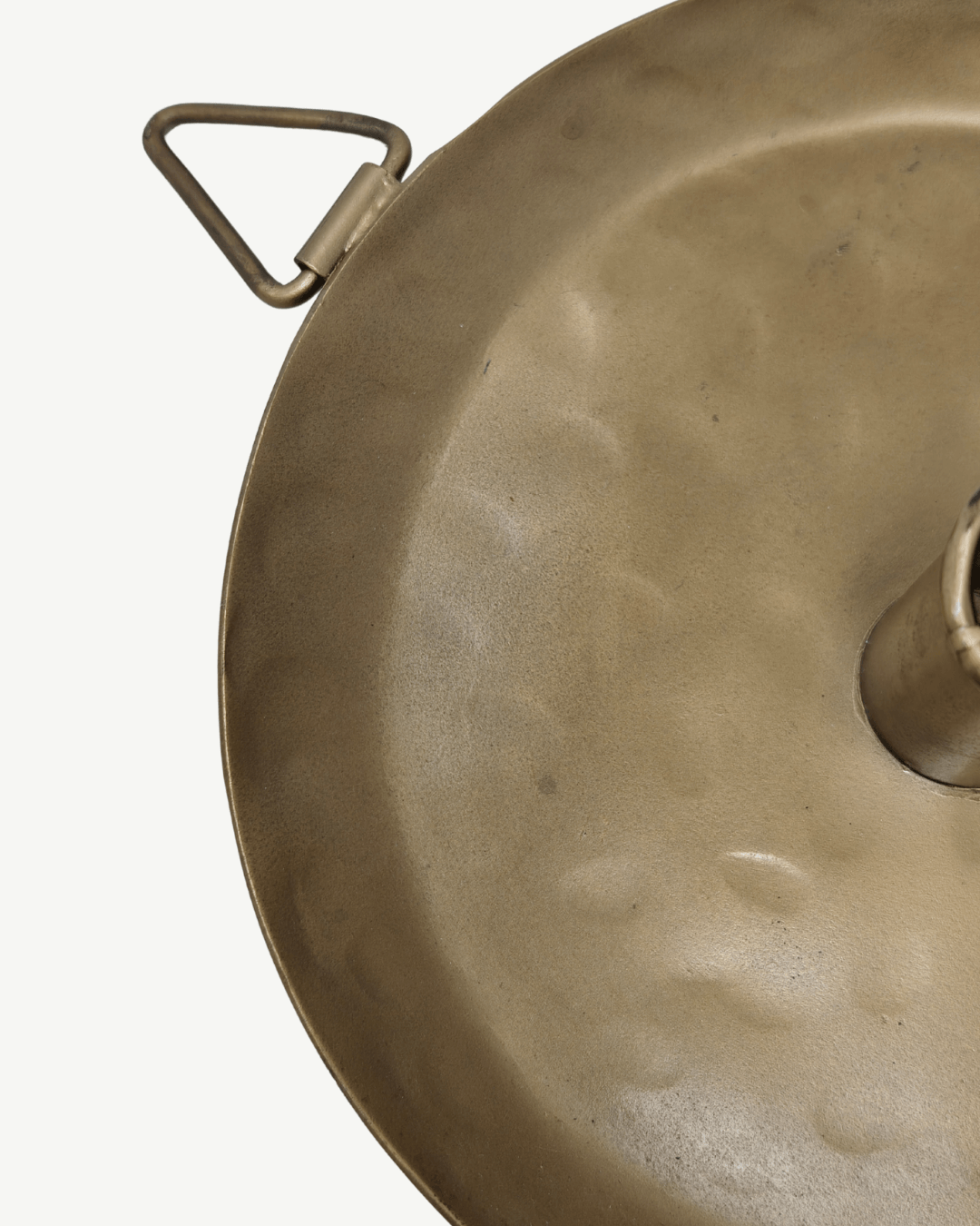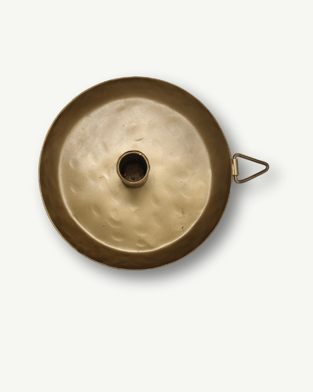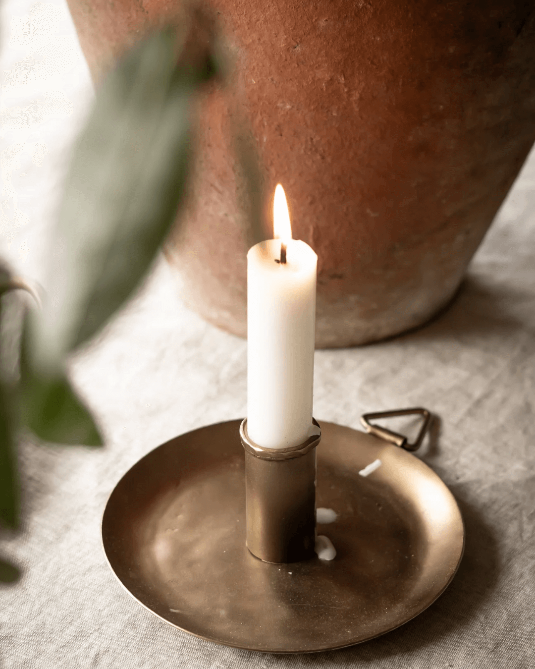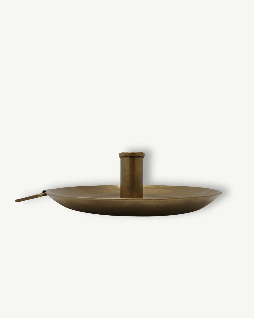 This timeless dinner candle holder is beautifully handcrafted and finished in brass, perfect for any occasion. The warm tone adds a touch of elegance to any setting. The plate is ideal to catch wax drips. Ideal for a tables-cape, shelf styling or console with a tall dinner candle