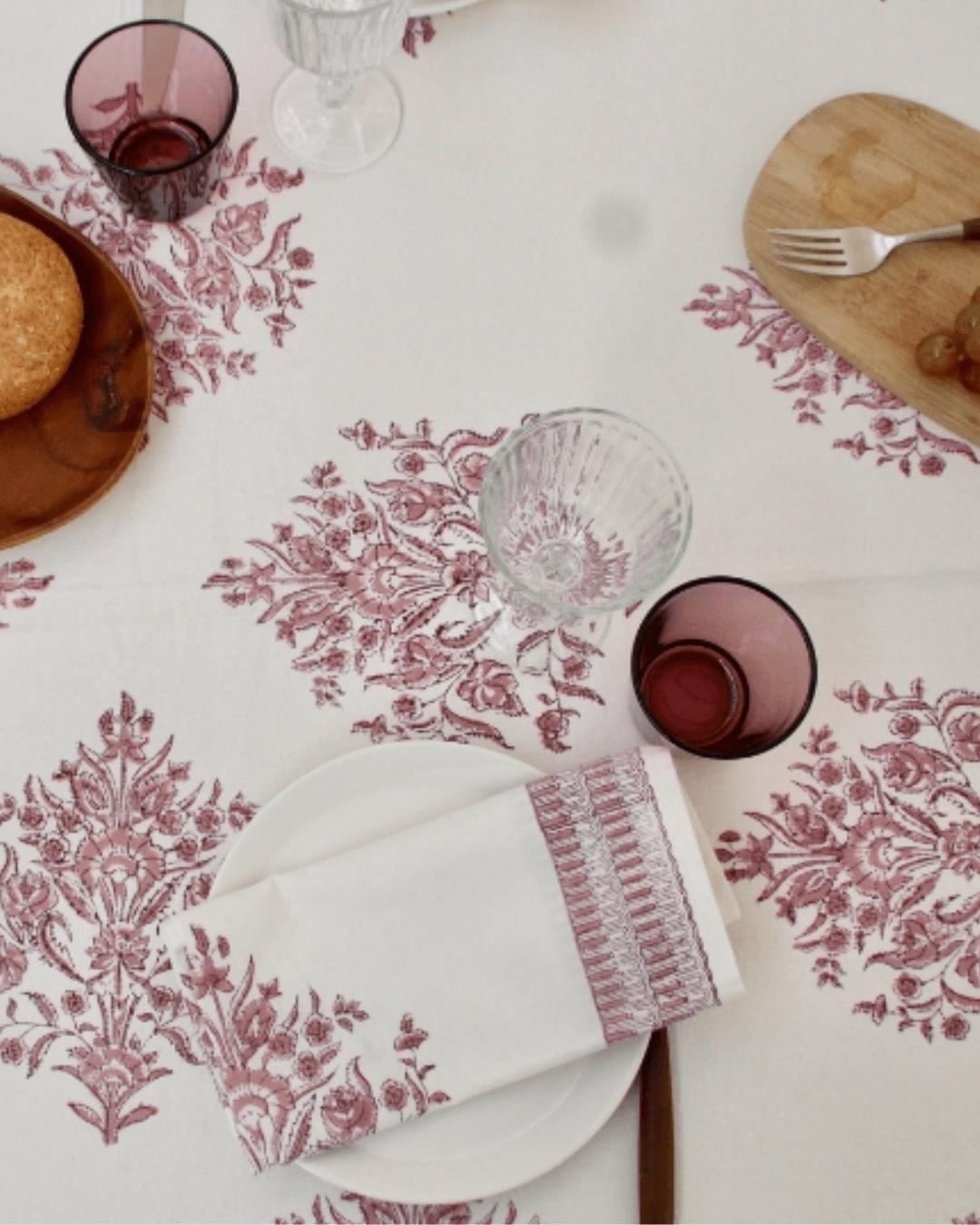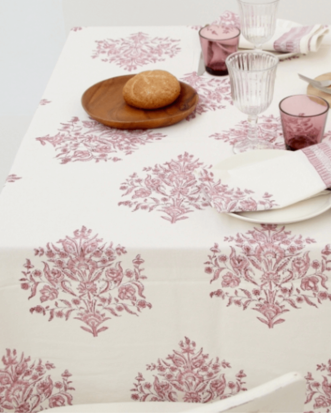 pink tablecloth, best tablecloths, vogue tablcloths, maison margaux, mrs alice, block print tablecloth, cotton tablecloth