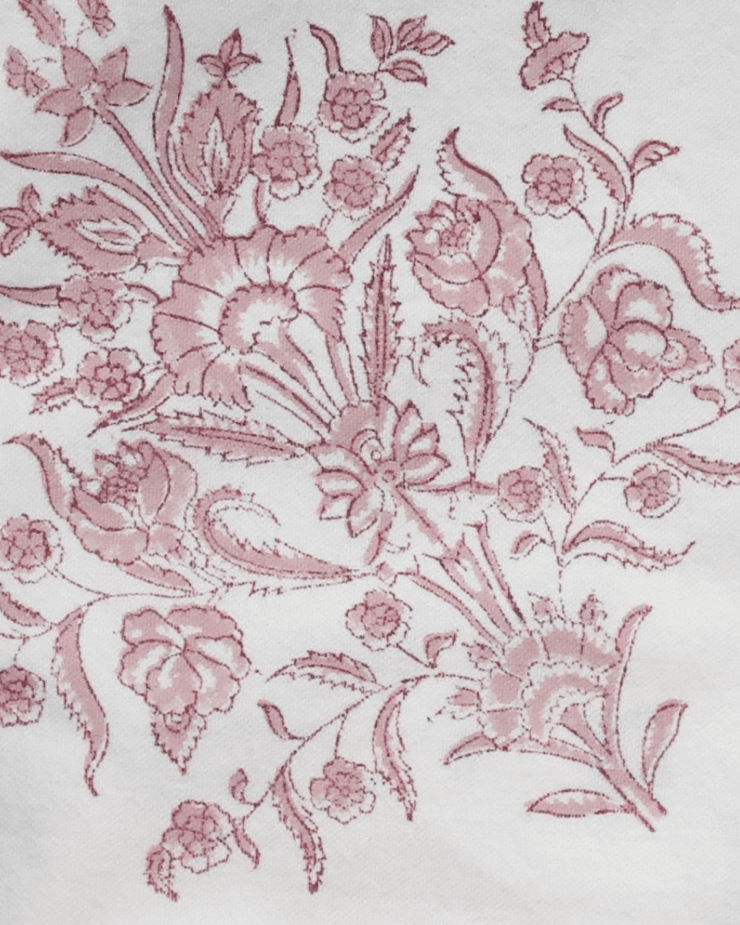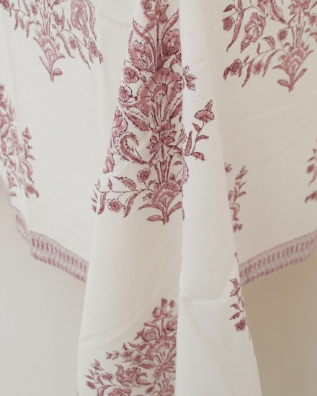 This elegant Varmala Roza tablecloth adds the perfect touch of sophistication to your table. Hand crafted with a delicate design of soft muted pink on an off white background, this tablecloth is block printed for a truly one-of-a-kind look.