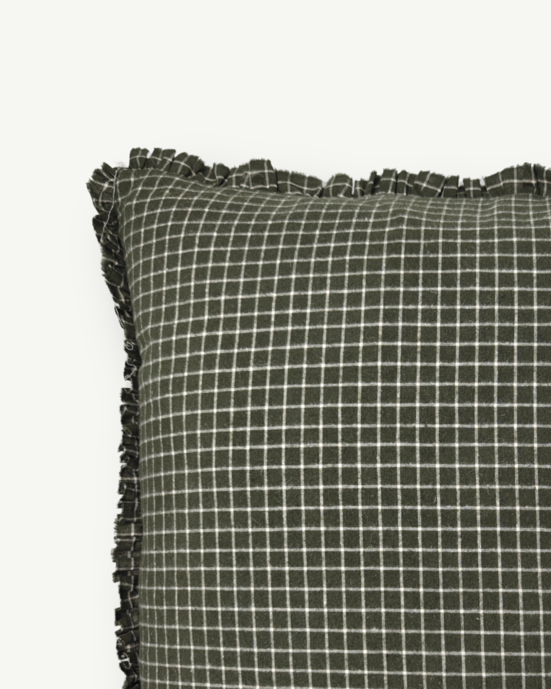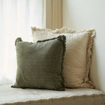 Beautiful olive green check pattern cushion, featuring a delicate ruffle design. The perfect choice for mixing and matching with plain linens, stripes, or other patterns. Made of 100% cotton for ultimate comfort and style.